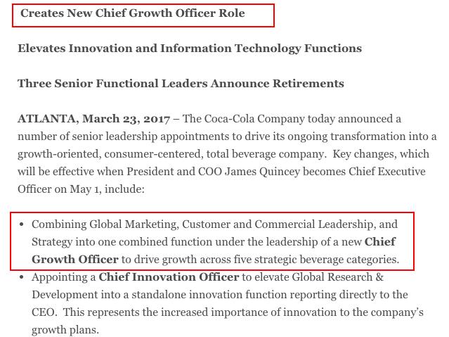 首席增长官是公司增长团队(Growth Team)的负责人,负责整个公司的产品和用户增长。这一点,可口可乐在声明中已经说得很清楚了。