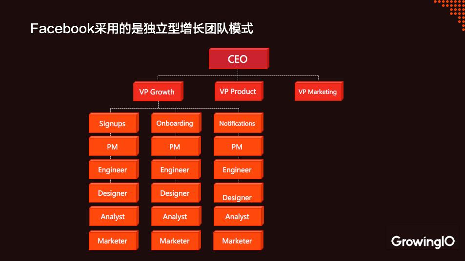 Facebook 是典型的独立型增长团队模式,增长团队的负责人直接汇报给扎克伯格。虽然设置有 VP Marketing ,但是 Growth Team 里面也有专门的营销专家,两者是互补的。