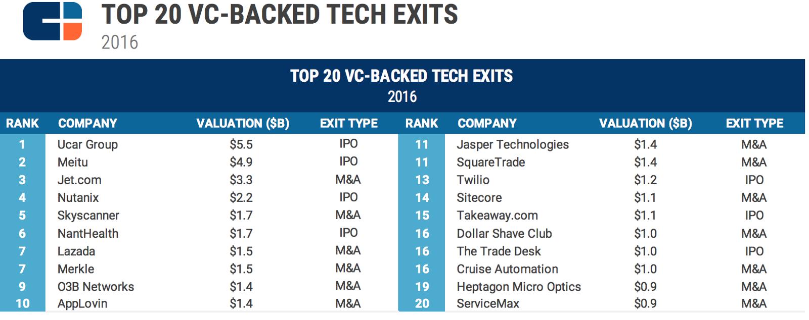 有趣的一点是,对VC而言,5亿美元和25亿美元的退出其实“差别不大”——根据CB Insights数据,2016年的M&A/IPO退出中,由VC投资的5亿美元以上市值公司不到10%,其中美国VC投出的25亿美元以上市值公司只有Jet.com一家。