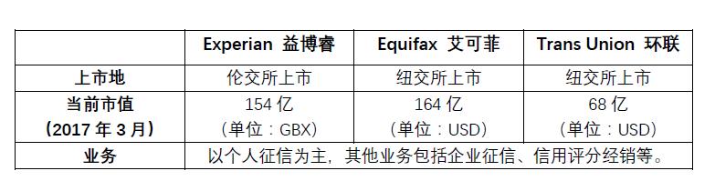 美国在个人征信领域的三大征信局分别是:Experian、Equifax、Trans Union,形成三家寡头垄断的格局。