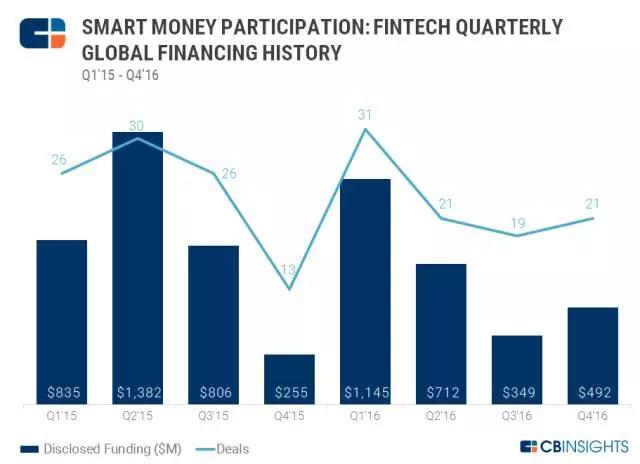 风投收割金融街科技创业公司的打法日趋成熟,一窝蜂的海投现象2016年以来已基本绝迹。这次,我们不谈大热的区块链或人工智能,而是整合CB Insights的数据,多图深挖风投在金融科技整体投资趋势和标志性投资案例,看看这些“Smart Money”哪家强。