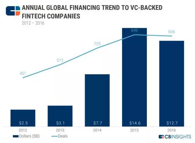 去年,全球风投共向金融科技创业公司投资127亿美元,共计836单,如下图。