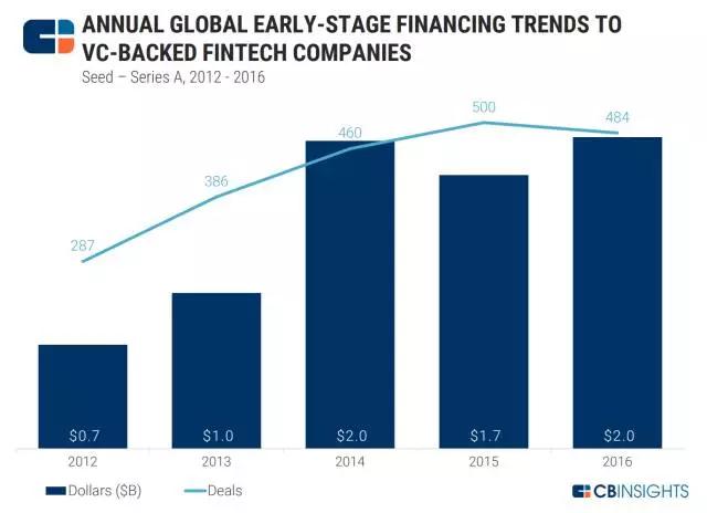 种子轮到A轮的融资最能看出风投认可的金融科技概念及其商业潜力。上图进一步总结了2012年~2016年早期创业公司的融资走势。2016年全球种子轮到A轮的融资达20亿美元,共计484单,相比2015年的500单下降了3%,但融资额度则有18%增长——风投看得更准,下注更给力。