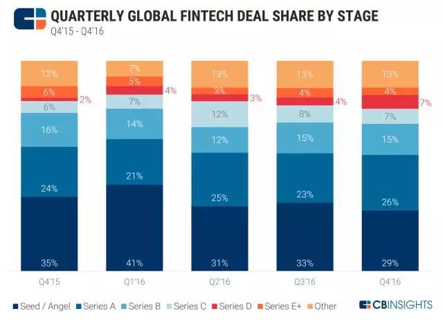 上图则按照融资阶段总结了2015年第四季度到2016年第四季度的融资数量比例,可以看出,种子轮/天使轮(最深色部分)比例在最新的季度首次跌破30%,而D轮则首次超过4%,同样可以看出投资走向稳健。