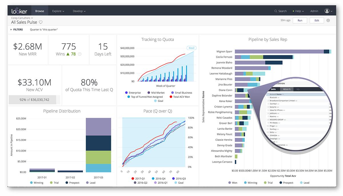 Looker的订阅服务为公司提供了广泛的选择,既可以使用可视化仪表板,也可以从Slack或Salesforce等应用程序中访问数据,其定价因用户席位和用例而异。