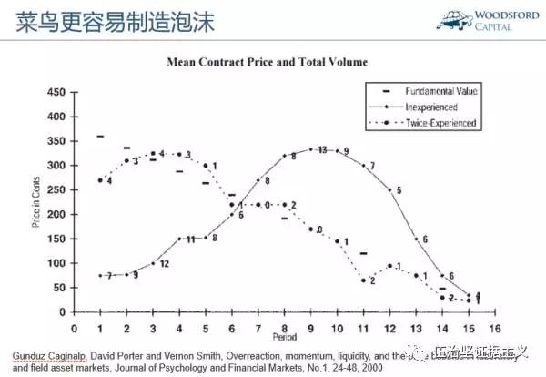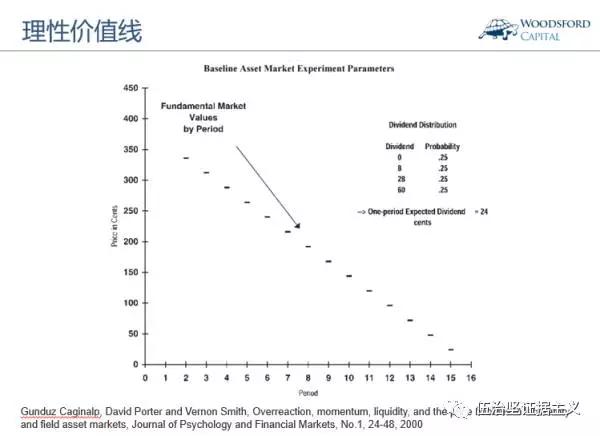研究人员邀请了一组实验对象来参加一个炒股模拟大赛。整个模拟大赛耗时2小时。这些实验对象被告知,在这两小时内,他们互相交易的股票会分15次红,也就是说每过8分钟分一次红。根据计算我们可以得知,每次分红后,该股票的基本价值会下降,因此其理性价值线是一条向下倾斜的直线。