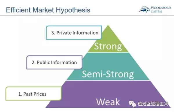 在“有效市场假说”体系里,法码教授将市场分为三种:弱有效,半强有效,和强有效。在弱有效市场中,证券过去的历史价格对未来没有预测作用,通过技术分析来判断证券未来的价格走向纯属浪费时间。在半有效市场中,所有的公开信息都被证券价格充分消化,不管是技术分析还是基本面分析都无法预测证券未来的价格。而在强有效市场中,即使是内幕消息也无法帮助投资者提高预测的准确度。
