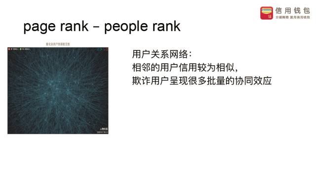 people rank也可以在防欺诈上起到作用。在网络欺诈里,很多欺诈活动都是有协调特点的。他们在做攻击和欺诈申请时都是有行为特征的。