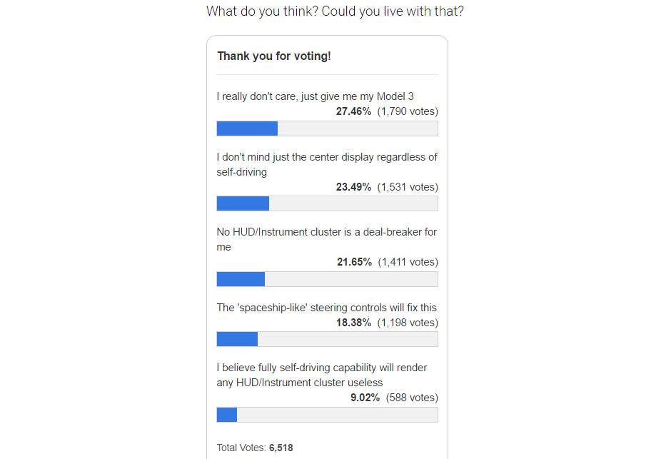 如果Model 3最终真的只有一个中心大屏,你能接受吗?外媒Electrek曾做了一个投票调研,在6518位网友中,只有1411位网友表示没有HUD显示器会极其失望,占比21.65%。而其他网友都相信可实现自动驾驶技术的Model 3不需要除中心大屏之外的多余屏幕,也有部分网友相信特斯拉在Model 3内饰设计上憋的大招会使HUD显示器黯然失色。