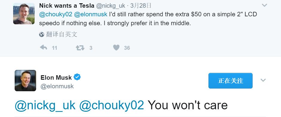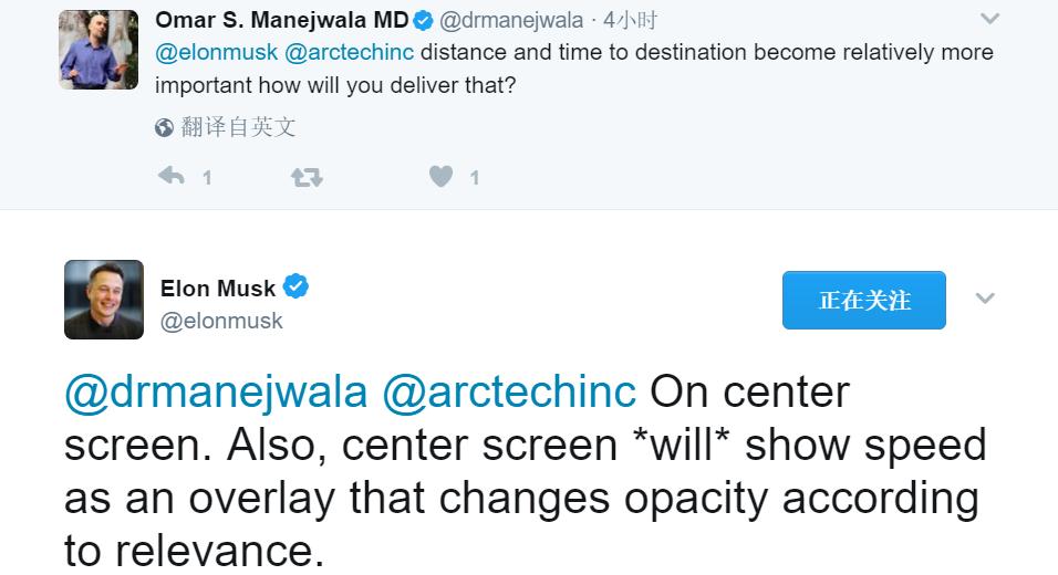 还有一位网友表示:“我宁愿多花50美元为Model 3加装一个简洁的LCD速度显示屏,如果没有(专用速度显示屏)的话。”Musk回应:“你不会介意(单一中心大屏)的。”