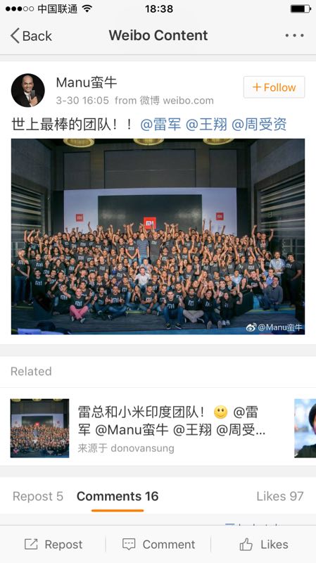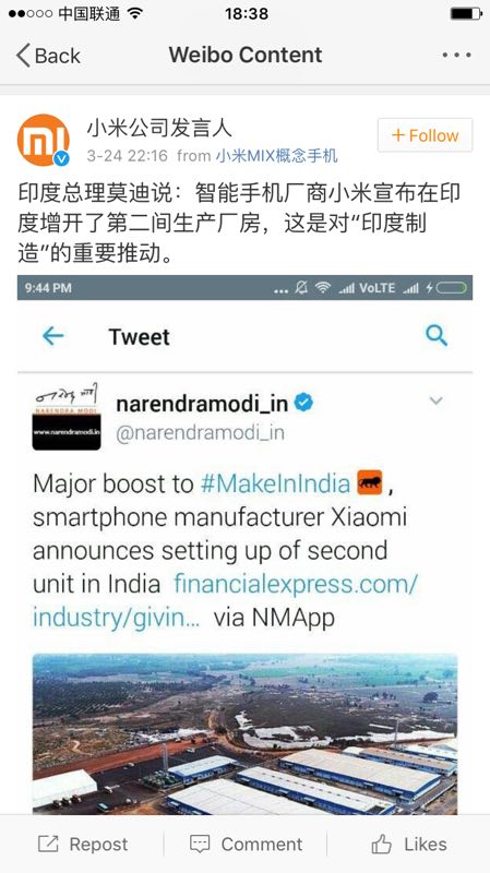 愚人节已过,每天在社交媒体同步行程的雷布斯已经3天没有更新了,其为期一周的访印行程结束。从Twitter和微博上莫迪总理、雷军和马努(Manu小米印度负责人)之间的互动可以看到莫迪对小米建厂的肯定与支持。