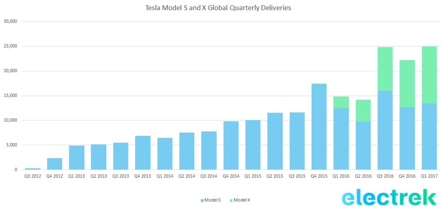 根据特斯拉官方,今年第一季度,特斯拉汽车交付达到了25418辆,其中约13450辆为Model S,约11550辆是Model X。这一指标相对2016年第一季度同比大涨了69%。创下了特斯拉交付历史最佳记录。尽管涨幅已经相当可观,但特斯拉强调,公司统计的交付量应被视为“保守”,原因是只有文件签署无误,已经交付到客户手中的车辆才会被计入。但通常最终的实际交付量会比统计结果高5%。