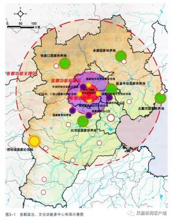 第一层次,北京六环路以内地区(半径15—30公里)为首都政治文化功能核心区;第二层次,北京六环外至环京高速(半径30—70公里)安排首都政治文化功能拓展区;第三层次,环京高速以外地区(半径80—100公里及部分300公里)为首都政治文化功能延伸区,为国家首都功能的发挥提供支撑和保障。