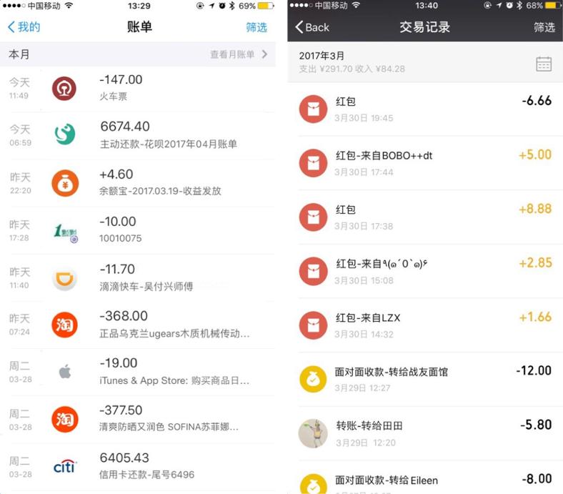从他们的账单看,大部分人支付宝里钱多,账单类目比较多,金额也比较大,微信支付金额小一些,以红包转账,线下小额支付占主体。
