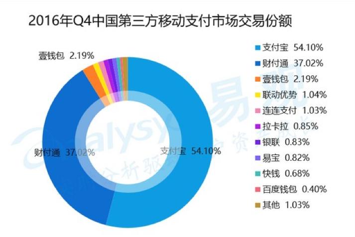 在易观最新发布的数据中,支付宝市场份额为54%,财付通(微信+QQ钱包)为37%。总体看,移动支付的市场集中度要远高于整个网络支付的大盘。