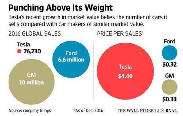 正是由于销量、营收和利润上天壤之别的差距,就出现了更奇葩的说法和比较。例如市场研究公司Navigant的高级研究分析师称:福特售出的每一辆汽车的利润都很可能高于特斯拉在整个2016年中所创造出的全部利润;巴克莱银行分析师则表示,如果拿市值除以销量,特斯拉每辆车净值可达60万美元,福特每辆车只值7000美元,而美国《华尔街日报》此前更是把汽车企业的销量和市值联系起来做了统计比较发现:特斯拉每卖出一辆车,转化成股价就是4.4美元,而福特和通用每卖出一辆车,对应的股价只有32美分和33美分。