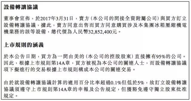 虽然,目前威灵控股的估值处于一个极低的状态,不过从最近的一些关联交易上看,关联交易方似乎比二级市场的投资者更加看好威灵控股的价值,比如,就在2017年3月31日,威灵控股将冰箱压缩机电机业务出售给美的旗下的一家附属公司。