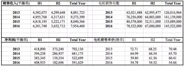 上图是威灵控股从2013年到2016年的销售收入、净利润、电机销售台数以及电机销售单价。从上图中,我们基本上可以看到以下事实:
