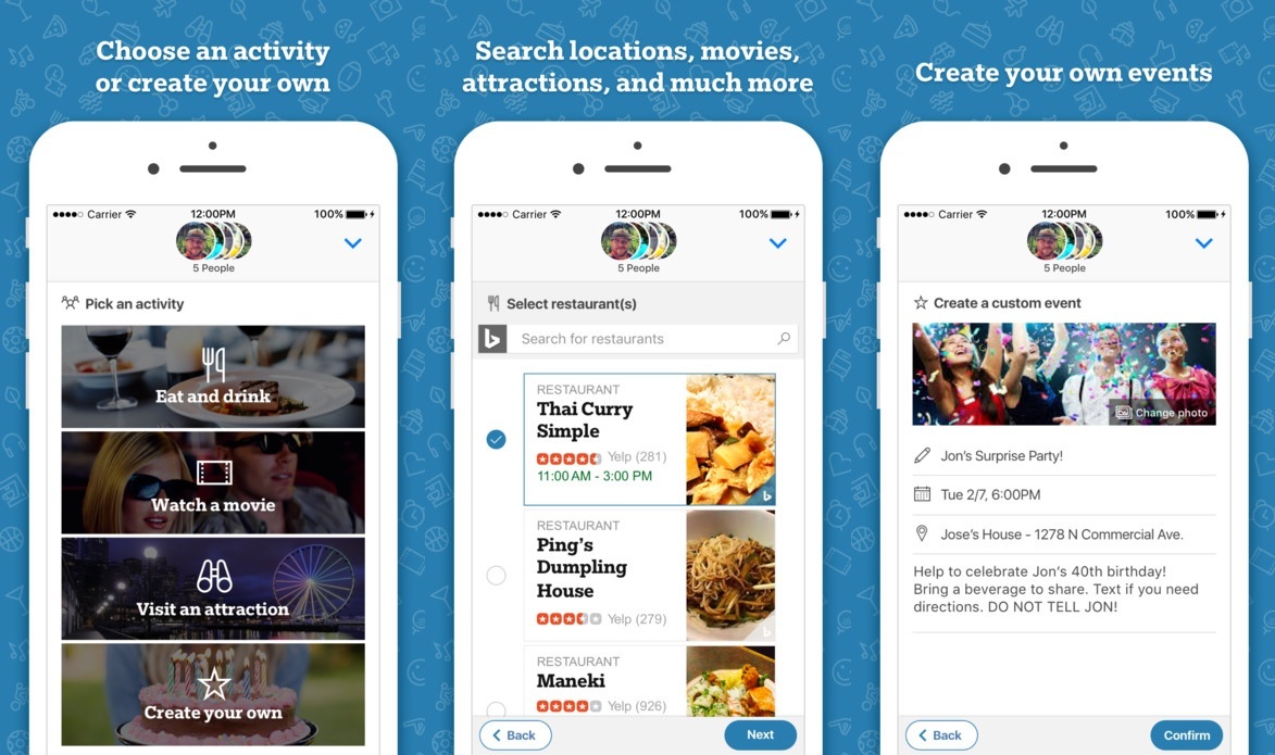 当你下载该APP后,系统会提示你对活动种类进行选择,比如选择“吃喝”、“看电影”、“游览一个名胜古迹”或者“自定义”等等。在你选择了其中一类活动、同时允许分享自己的位置后,微软的搜索引擎Bing会为你的进行推荐。为了提高推荐的精确匹配,用户可以在搜索中加入更多内容,比如具体位置、活动名称、时间等。