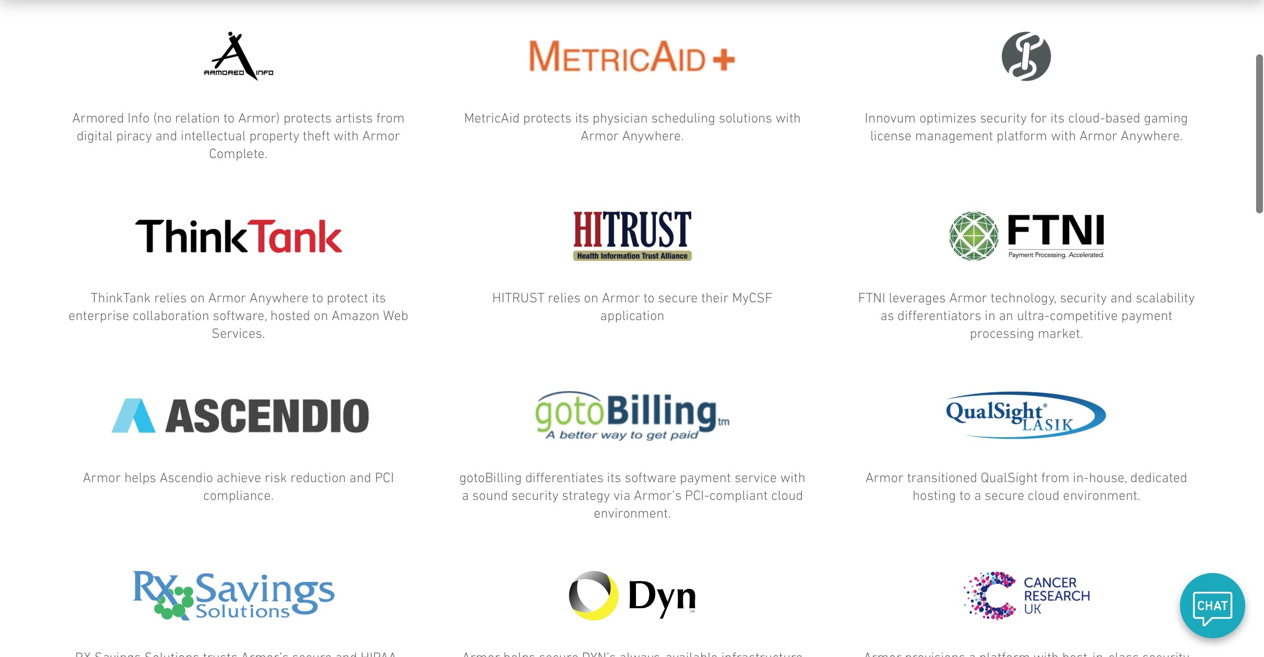 Armor能保护用户的关键资产,能提供围绕企业安全威胁的分析、检测和修复,以及完整的云安全解决方案,服务对象包括零售和电子商务企业、医疗机构、支付行业和金融机构等。公司的灵活型解决方案能帮助用户遵守PCI、HIPAA/HITRUST等协议,并且可以根据自身需求添加自动化,机器学习和大数据分析等技术套件的业务。