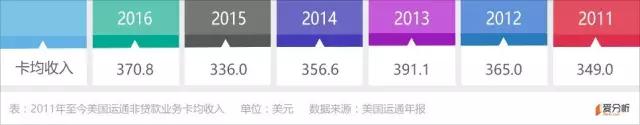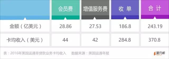 2016年美国运通卡均年费为44美元,全年会员费为28.86亿美元,由此可以推算美国运通约有6559万张活跃卡,对应卡均收入约为370.8美元。