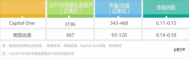 其中Capital One的生息资产指的是其全部业务的生息资产,综合考虑增速、利差等因素,将美国运通的余额倍数设为[0.14,0.18],预计2017年美国运通贷款余额为667亿美元,可以估算美国运通信用卡贷款业务的估值为93-120亿美元。