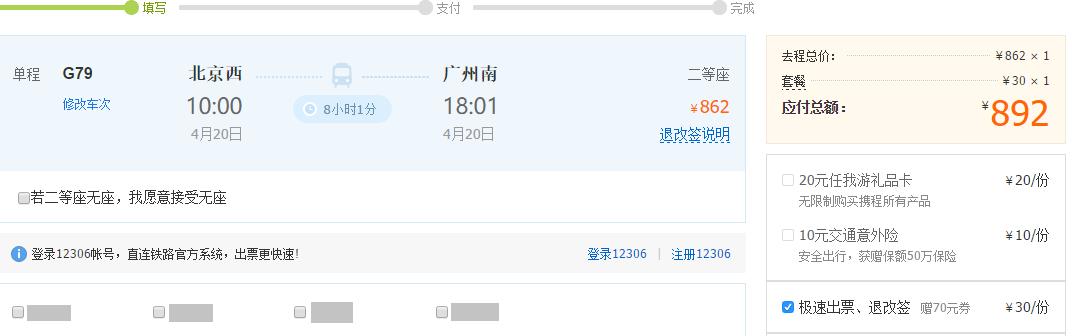 除了机票之外,在购买高铁的时候,也有会类似的情况发生。在进入付款页面的时候,系统会默认购买一个名为“极速出票、退改签”的服务。(然而却似乎找不到这个服务有什么用……毕竟高铁票本来退改签好像就不难。)