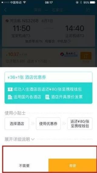 页面上并没有直接取消的按钮,而是还需要用户进一步点到某一个附加服务上,再次展开页面,点击不需要,才能取消。也就是说,在APP上,用户至少需要做不少三次点击,打开新列表,才能取消这个默认的“酒店优惠券”。