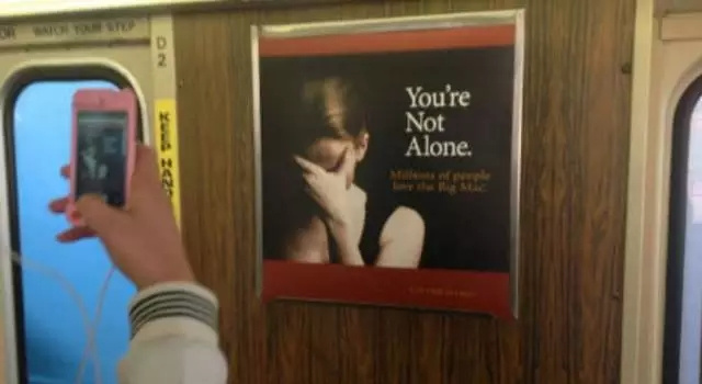 麦当劳在多年以前也发布了一则“恶搞”抑郁症的广告。一位妇女在黑暗的背景下哭泣,旁白写着“你不是孤独的一个人,所有人都喜欢巨无霸”。