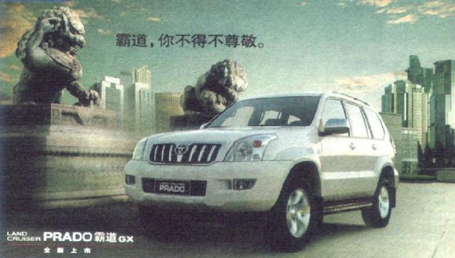 2003年11月,丰田为了宣传其新车,拍了一支广告。一辆行驶在路上的丰田“霸道”引来路旁一只石狮的垂首侧目,另一只石狮还抬起右爪敬礼,文案为“霸道,你不得不尊敬”。
