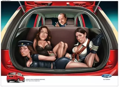 福特在2013年推出一则广告。广告中,3位艳丽女郎被塞挤在福特汽车后备箱中,而绯闻不断的意大利前总理贝卢斯科尼则在前部得意地比划着象征胜利的“v”字。