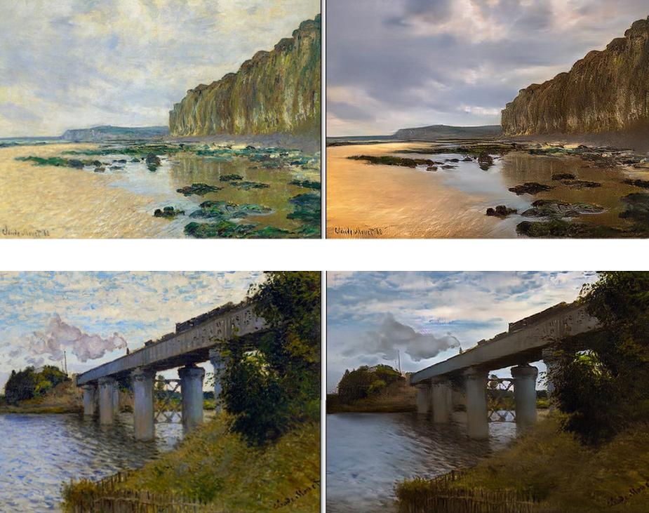 换句话说,虽然他们不是“莫奈本人”,不能准确地描绘出那个现场,但是他们却已经有了莫奈一系列的画与现实风景照。从这中间,他们就可以推断出这两者之间风格差异,并推算出当一套风景绘画照变成另一套风景照的模式。