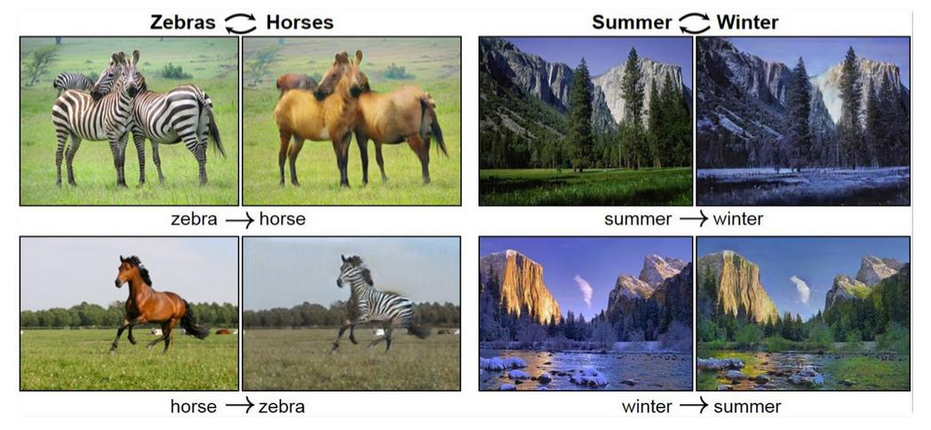更厉害的是,他们还能用这项技术把照片里堆满积雪的冬季变成了郁郁葱葱的夏季,甚至将马变成斑马!