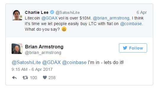 据悉,有着比特币“弟弟”之称的莱特币(LTC)近期价格飙涨,在GDAX的单日交易额突破1000万美元,单日价格涨幅达20%,价最高时达12.7美元。为此,莱特币的创始人李启威(Charlie Lee)和Coinbase CEO布莱恩•阿姆斯特朗(Brian Armstrong)近期在推特上双双表明愿意促进莱特币在Coinbase上线。