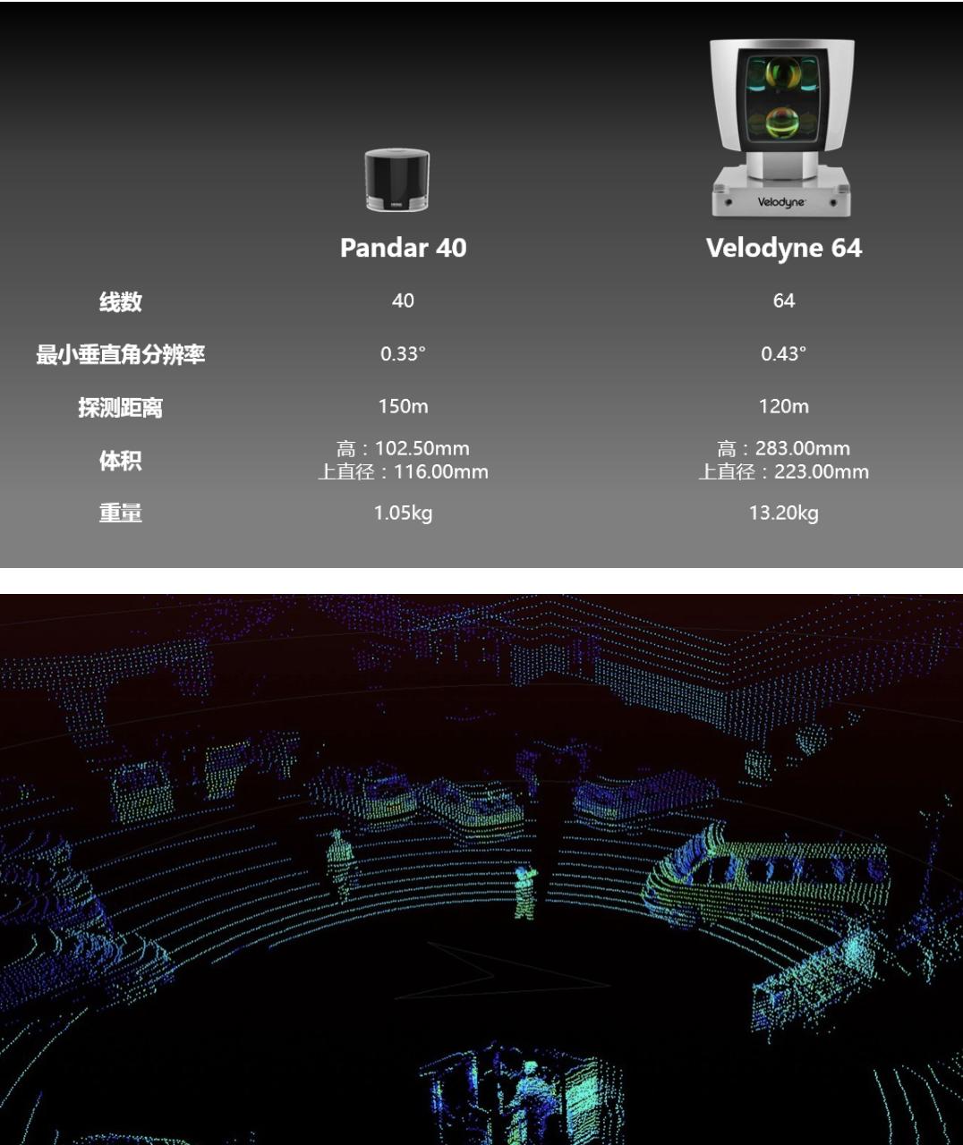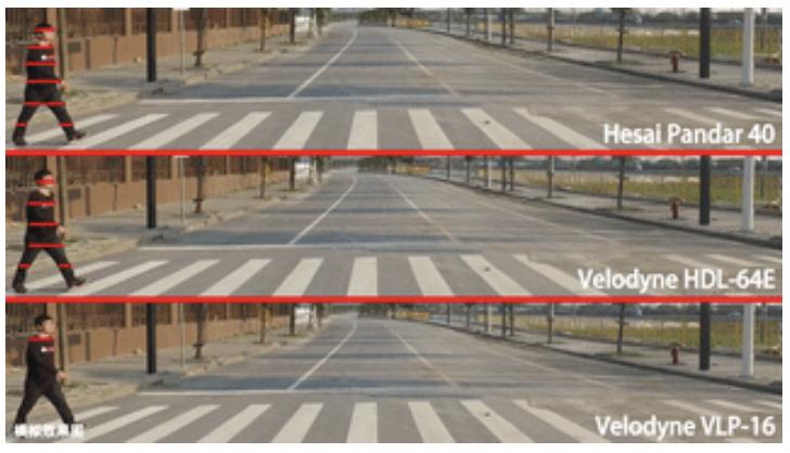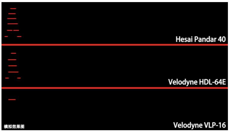 不同角分辨率的激光雷达,在50米处能投射在行人身上的线数不同,禾赛40线激光雷达人身上会有6条线,Velodyne 64线会产生5条线,Velodyne 16线只会产生1条线。