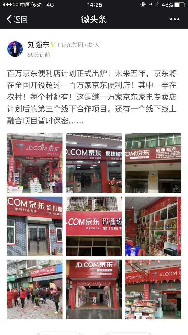 4月10日下午,京东集团创始人刘强东在微头条表示:“百万京东便利店计划正式出炉!未来五年,京东将在全国开设超过一百万家京东便利店,其中一半在农村。这是继一万家京东家电专卖店计划后的第三个合作项目。还有一个线下线上融合项目暂时保密……”