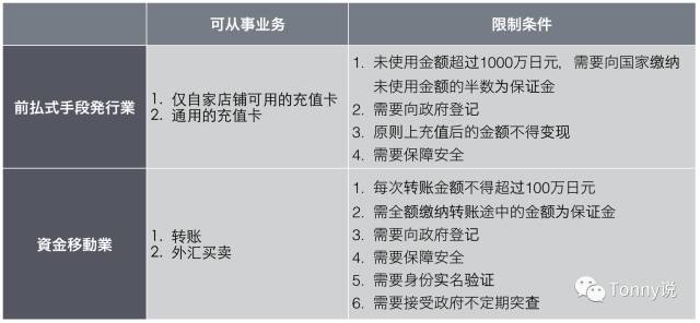 日本对此在一开始的时候是限制第三方支付的存在,《資金決済法》出来以后,对沉淀资金需要保障的支付能力问题,做了严格的限制。我简单的梳理了一下,整理了下面这张表。