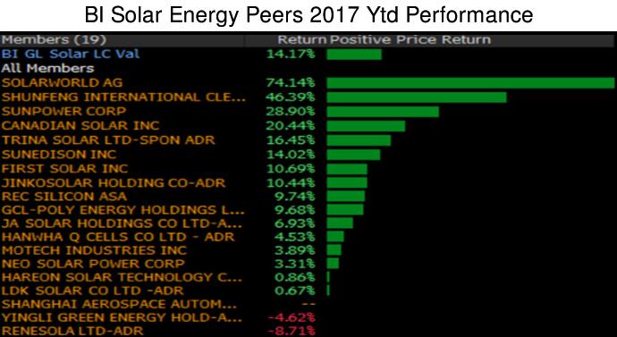 据彭博行业研究平台数据,继 2016 年 52% 的下跌幅度之后,2017 年前两个月,太阳能行业集团股价上涨 14%。太阳能行业股市回暖,加之油价恢复到 50 美元左右,业内情绪可能有所提振。主要面向中国市场的顺风国际清洁能源有限公司(shunfeng international clean energy)和阿特斯阳光电力集团(Canadian Solar)寄希望于今年上半年中国太阳能需求能够增加。First Solar 和 SunPower 等美国太阳能同行公司采取的削减成本的举措也可能会缓和业内对价格和行业产能过剩的担忧情绪。