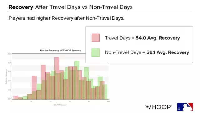 Whoop的研究报告包含了球员身体恢复程度与其表现的正向关联:无论投手还是击球手,其身体状态恢复得越好,投球速度以及击球速度都更快。Whoop的数据也表明,球员在经历长途异地比赛后,由于睡眠状况受到影响,需要比在本地打比赛更长的时间(约两天)才能恢复到出发之前的水平,这为球队教练合理安排球员赛程提供了依据。