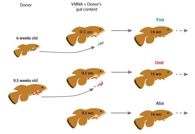 实验人员将9周半大的中年非洲青鳉鱼泡在含有抗生素的水中,让抗生素杀死它们自身的肠道微生物,再将这些中年鱼转移到无菌水中。随后,他们收集6周大的青年小鱼的粪便并撒在中年鱼生活的无菌水里。作为对照,研究者同时设置了饲喂同龄鱼的粪便的对照组、只饲喂抗生素的对照组和未经过任何处理的对照组。