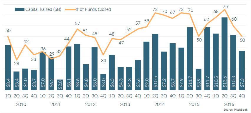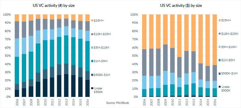 当我们看下一张图表时,显示出风险投资的趋势,很明显这种趋势不大可能会放缓。美国风险投资和增长型资本基金在2016年达到历史最高的筹资水平,这意味着未来几年将有大量的投资资金。鉴于我们已经看到过去几年的交易数量下降了,特别是在种子阶段,我们可能会在接下来几年继续将资本集中在少数的公司。