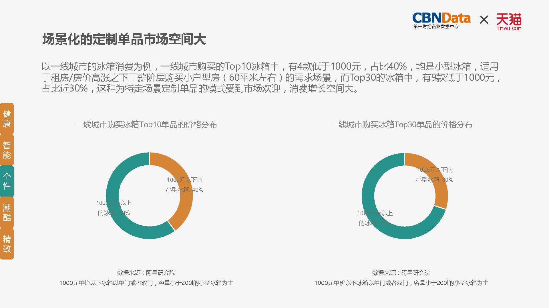 场景化的定制单品以一线城市的冰箱消费为例,一线城市购买量排在前十名的冰箱中,有4款低于1000元,占比40%,均是小型冰箱,适用于租房/房价高涨之下工薪阶层购买小户型房(60平米左右)的需求场景,而购买量排在前三十名的冰箱中,有9款低于1000元,占比近30%,这种为特定场景定制单品的模式受到市场欢迎,消费增长空间大。