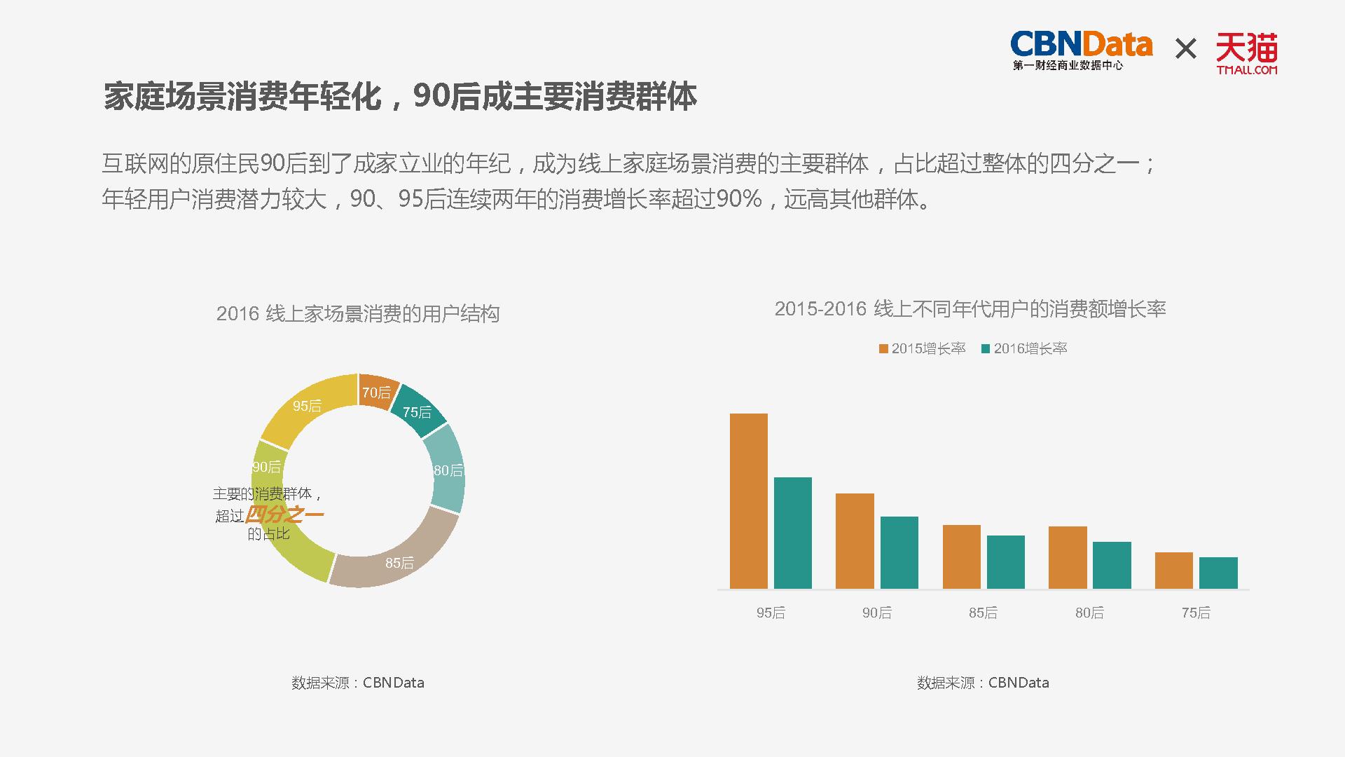 作为互联网原住民的“90后”这一代人,已经到了成家立业的年纪,成为了线上家庭场景消费最主要的群体,占比超过整体的四分之一。CBNData《报告》对比2015、2016年两年的数据发现,年轻用户消费潜力较大,90、95后连续两年的消费增长率超过90%,远高于其他年龄段。