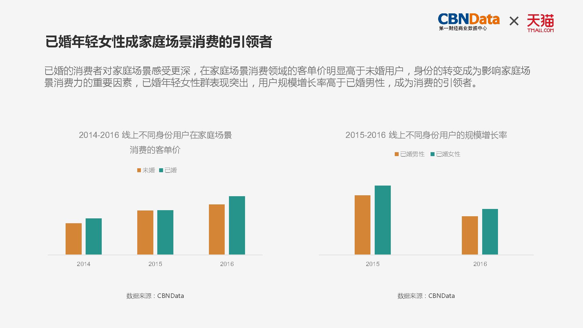 此外,CBNData《报告》显示已婚年轻女性成家庭场景消费的引领者。已婚的消费者对家庭场景感受更深,在家庭场景消费领域的客单价明显高于未婚用户,身份的转变成为影响家庭场景消费力的重要因素。