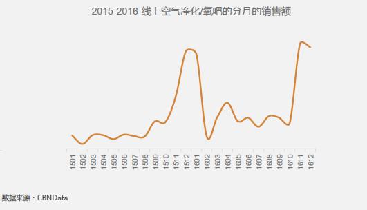 人人关心的雾霾问题,则引爆了空气净化器的线上消费。健康呼吸的消费在线上热度持续增加,从时间分布来看,12月份进入雾霾月后,线上空气净化器的消费也达到顶峰,雾霾最严重的12月和1月是空气净化器消费的高峰期。