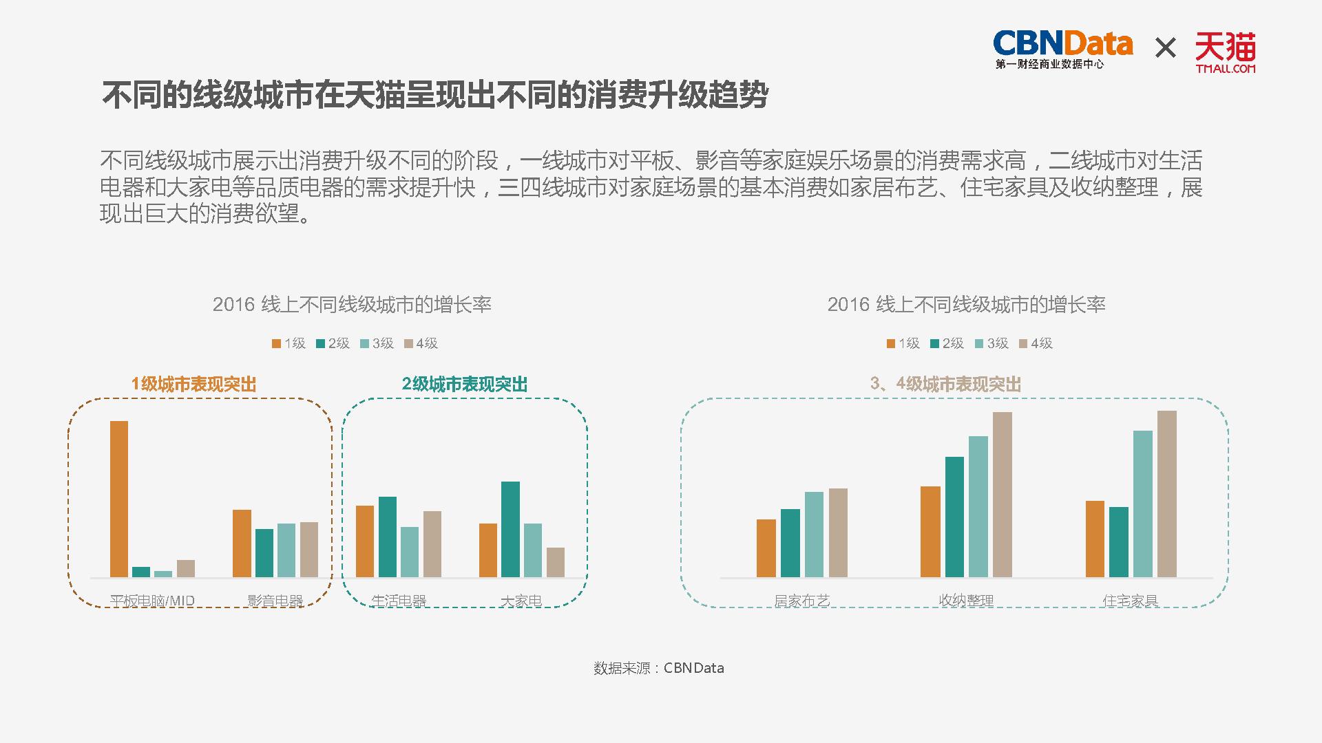 消费升级的现象在生活中随处可见,生活在不同城市的人们的线上消费行为,展示出所在城市消费升级的阶段性特征。CBNData《报告》发现,一线城市对平板、影音等家庭娱乐场景的消费需求高;二线城市对生活电器和大家电等品质电器的需求提升快;三、四线城市对家庭场景的基本消费如家居布艺、住宅家具及收纳整理,展现出巨大的消费欲望。