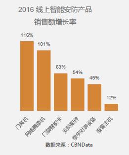 同时智能新产品不断涌现且增长迅速。以智能安防产品为例,这个行业起步晚,市场并不成规模。但随着智能家居行业的发展,智能安防为家庭生活提供更加安全的环境,逐渐成为刚需,市场潜力大,特别是门禁系统,2016年智能门禁机增长率达到116%,门禁智能卡也达到了63%,增幅显著。此外,管理运动和健康的智能手环在线上呈现爆发式的增长,2016年天猫平台共卖出约900万只智能手环。