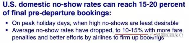 超售的一个主要原因在于noshow:(2007年的数据,美国境内航班在起飞前noshow的比例会达到15%~20%)