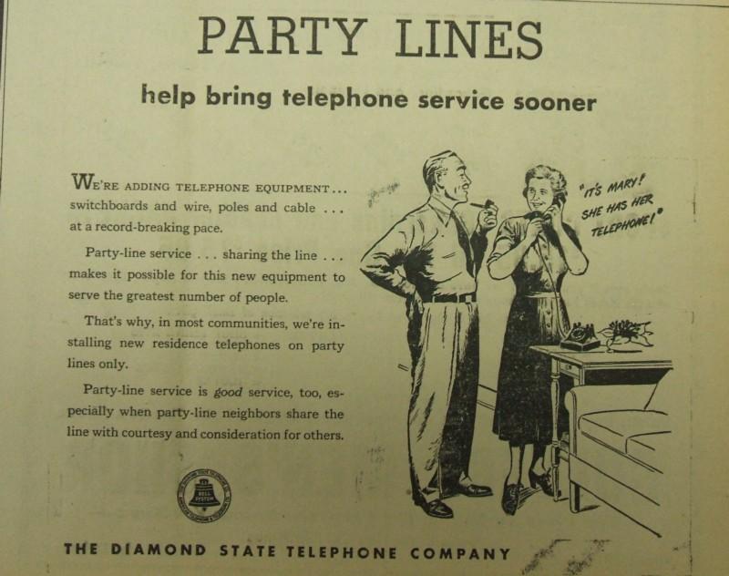 电话,作为信息技术的下一项重大进步,在二十世纪早期取得了史无前例的成功。然而,个人电话线路出奇昂贵,所以,邻居们会共用一条线路,也就是「合用线路」。商业广告曾提倡共用电话的几户人家能「友好礼貌」地使用这项共享技术。