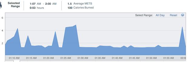 用一个简单的计步器和卡路里的计算器,我就可以判断早上是有过性行为还是去过健身房,因为性交时每分钟燃烧的卡路里有着特殊的分布曲线。(下图来自我的健康追踪器,我在这一时段没增加多少步数,但在开始和结尾处消耗了许多能量。除了性行为,基本上没有其他活动会有这么特别的曲线形状。)